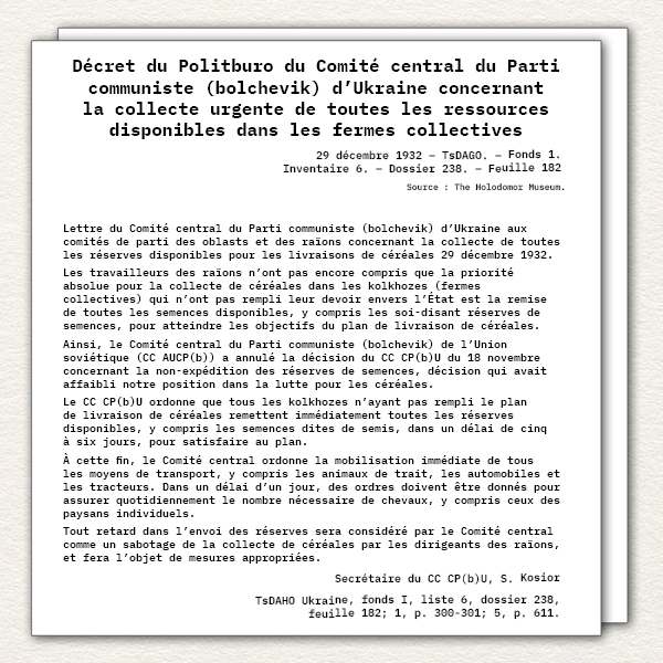 Entre 1932 et 1933, des politiques répressives vinrent aggraver la crise agricole déjà en cours. Le gouvernement soviétique ordonna la confiscation totale des céréales, même dans les villages où la population mourait de faim. Des brigades de l’État fouillaient les maisons afin de s’assurer que les habitants ne gardaient aucune réserve de nourriture.